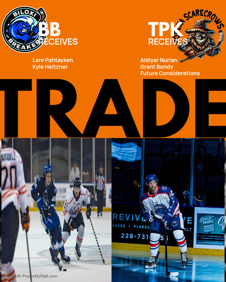 The Topeka Scarecrows of the Federal Prospects Hockey League have made a trade with the Biloxi Breakers to acquire Forward Aldiyar Nurlan, Defenseman Grant Bondy, and a future consideration in exchange for Lare Pahtayken and Kyle Heitzner.